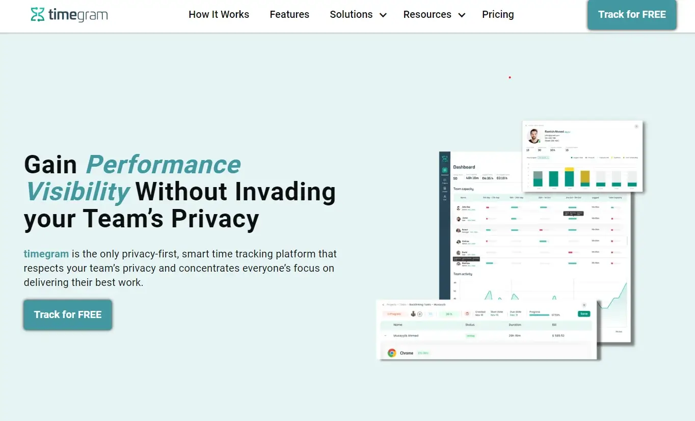 It is, hands down, among the most suitable TimeCamp alternatives. One of the standout features of timegram is its unwavering commitment to user privacy. By prioritizing privacy, timegram cultivates a culture of accountability and trust within teams, resulting in increased productivity and success. This means: